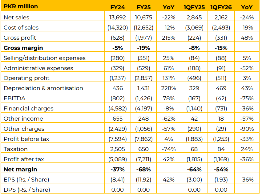 AGHA reported loss per share of PKR 11.92 in FY25 (F24: 8.41). In 1QFY26, the LPS remained PKR 1.93 (1QFY25: 3.00). AGHA has faced severe turbulence over the last 1.5 years, largely due to a major fire incident in 2023 which disrupted operations and banking relationships, necessitating a comprehensive debt restructuring.