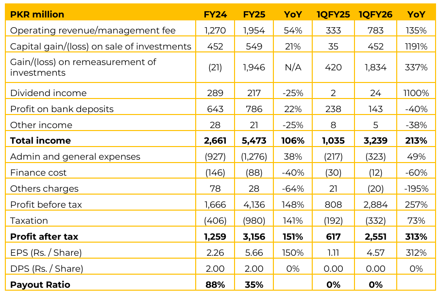 AKDSL reported earnings per share of PKR 5.66 in FY25 (F24: 2.26). In 1QFY26, the EPS remained PKR 4.57 (1QFY25: 1.11). AKDSL is described as the largest sell-side brokerage house in Pakistan. Management noted that while they used to say “one of the largest,” they now believe they are “The Largest” Corporate Brokerage House operating out of Pakistan.