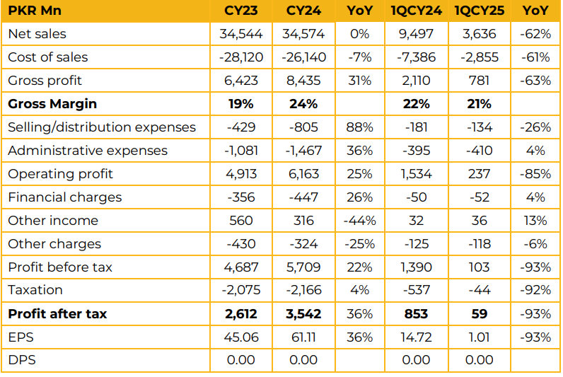 Net revenue in CY24 reached PKR 34.6 Bn remaining stagnant compared to CY23 with PKR 34.5 Bn. The company saw its gross margin increase from 19% in CY23 to 24% in CY24. In this fiscal year the company has seen its margin deteriorate to 21% in 1QCY25. Net revenue in 1QCY25 was PKR 3.6 Bn, down 62% from PKR 9.5 Bn in 1QCY24. As a result, earnings per share plummeted 93% from PKR 14.72 in 1QCY24 to PKR 1.01 in 1QCY25. AGTL is currently in the process of transforming its product line and improving production efficiencies.