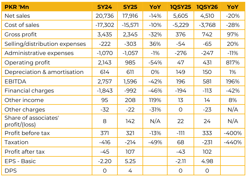 Current ex-mill prices are hovering at PKR 137–140 per kg, which remains below the projected cost of production. However, profitability in 1QFY26 was supported by the sale of carryover inventory that had been realized at higher prices in the PKR 165 175 per kg range, providing a temporary margin cushion. Management estimates that the total cost of production for the current season will fall between PKR 147 and PKR 150 per kg. The company also operates a 36 MW bagasse-fired power plant, of which approximately 10 MW is consumed internally. While the facility has the capacity to supply surplus power to the national grid, management noted that doing so is currently not economically viable given the rising market price of bagasse.