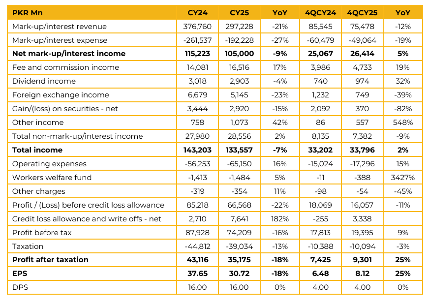 Allied Bank Limited reported earnings per share of PKR 30.72 in CY25, down 18% from PKR 37.65 in CY24. This translates into profit after tax of PKR 35.2 Bn compared to PKR 43.1 Bn in SPLY. The bank declared a dividend of PKR 16 per share in CY25, in line with PKR 16 in CY24.
