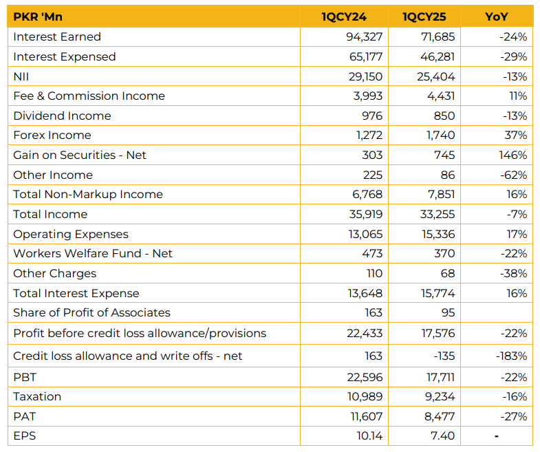 In 1QCY25, Allied Bank Limited (ABL) reported a net profit of PKR 8.45 billion (EPS: PKR 7.40), marking a 27% YoY decline from PKR 11.61 billion (EPS: PKR 10.14) in the SPLY. Total assets stood at PKR 2,738 billion as of March 31, 2025, reflecting a 3% YoY decline. Cash, bank balances, and lending to financial institutions fell by 59% YoY to PKR 164 billion, significantly sharper than the industry-wide decline of 8%.