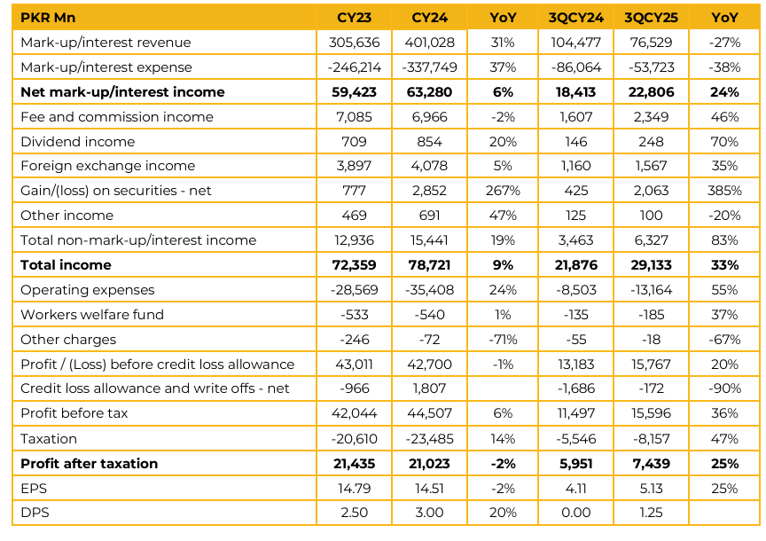 The management highlighted that it plans to maintain quarterly dividends policy in the future. Total revenue in 3QCY25 reached PKR 29.1 Bn against PKR 21.9 Bn in 3QCY24, an increase of 9%. This was primarily driven by a 19% increase in non-mark-up income from PKR 12.9 Bn in 3QCY24 to PKR 15.4 Bn in 3QCY25.