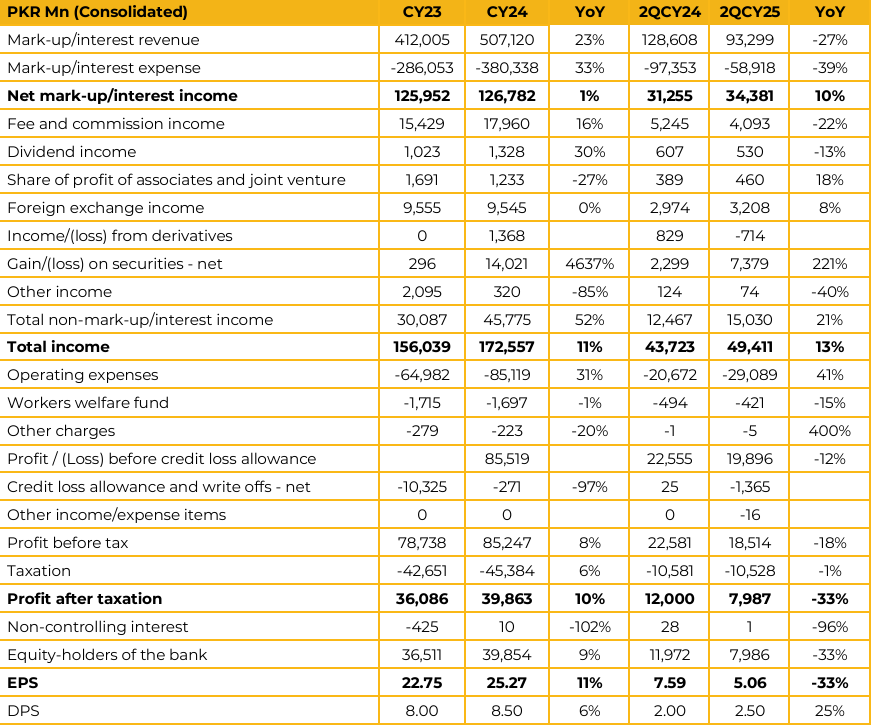 Bank Alfalah Limited reported consolidated earnings per share of PKR 5.06 in 2QCY25, down 33% from PKR 7.59 in 2QCY24. This translates into profit after tax of PKR 8 Bn compared to PKR 12 Bn in SPLY. The bank declared a dividend of PKR 2.5 per share in 2QCY25, up 25% from PKR 2.0 in 2QCY24. Total revenue in 2QCY25 reached PKR 49.4 Bn against PKR 43.7 Bn in 2QCY24, an increase of 13%.