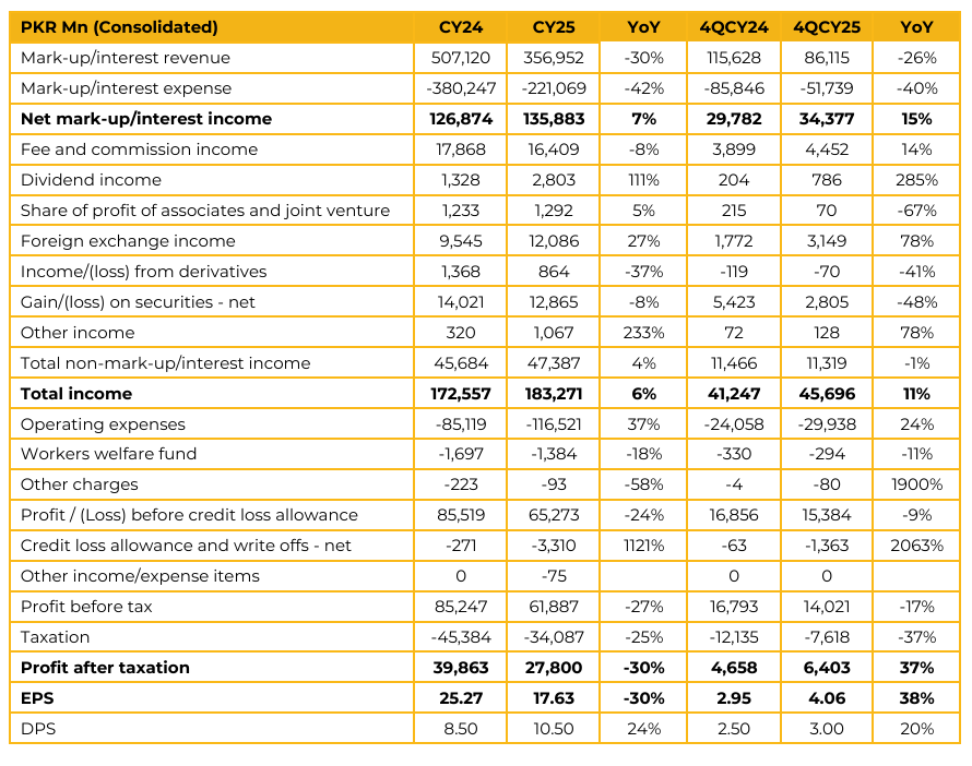 Bank Alfalah Limited reported consolidated earnings per share of PKR 17.63 in CY25, down 30% from PKR 25.27 in CY24. This translates into profit after tax of PKR 27.8 Bn compared to PKR 39.9 Bn in SPLY. The bank declared a dividend of PKR 10.50 per share in CY25, up 24% from PKR 8.50 in CY24. Total income in CY25 reached PKR 183.3 Bn against PKR 172.6 Bn in CY24, an increase of 6%.