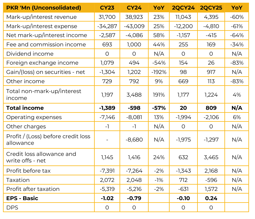 Bank Makramah Limited (BML) reported loss per share of PKR 0.79 for CY24, compared to PKR 1.02 in CY23. Furthermore, in 2QCY25, the company reported earnings per share of PKR 0.24, compared to loss per share of PKR 0.10 in the same period last year (SPLY).
