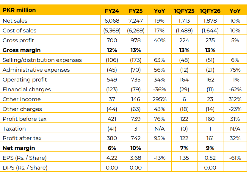 BFAGRO reported earnings per share of PKR 3.68 in FY25 (F24: 4.22). In 1QFY26, the EPS remained PKR 0.52 (1QFY25: 1.35). Profit after tax grew by 95% to PKR 742 million inFY25 (FY24: PKR 380 million). While, in 1QFY26 profit after tax grew by 32% to PKR 161 million (1QFY25: PKR 122 million). BFAGRO operates in Special Economic Zones in both Karachi and Faisalabad, which provides a tax exemption benefit.