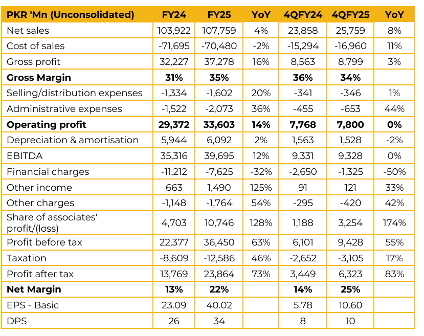 For FY26, the company expects local retention to remain at similar levels as last year. On the export front, the retention stands at PKR 8,500 per ton, and management expects this to remain stable as well. The gross profit (GP) margin for the year stood at 34%, and the company expects similar margins to be maintained in the current year.