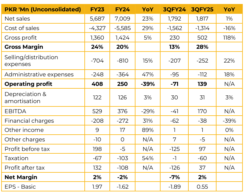 Bunnys Limited (BNL) reported loss per share of PKR 1.62 for FY24, compared to earnings per share of PKR 1.97 in FY23. Furthermore, in 3QFY25, the company reported earnings per share of PKR 0.55, compared to loss per share of PKR 1.89 in the same period last year (SPLY). The company has installed a 200 KVA solar system, with an additional 200 KVA currently in the pipeline and expected to come online soon.