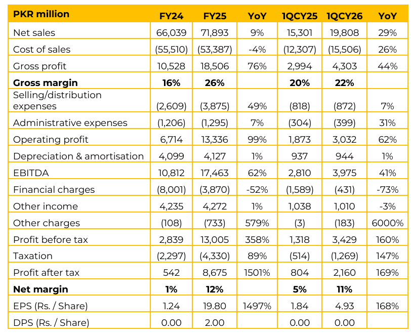 DGKC reported earnings per share of PKR 19.80 in FY25 (F24: 1.24). In 1QFY26, the EPS remained PKR 4.93 (1QFY25: 1.84). DGKC demonstrated significant resilience in FY25, operating at 79% sales utilization, which was meaningfully higher than the industry average of 55%.