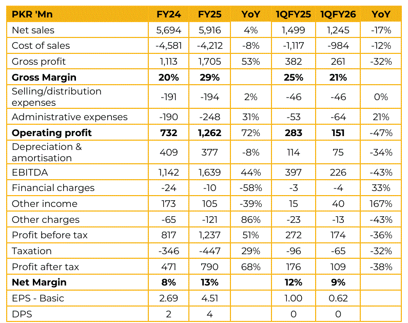 Descon Oxychem Limited (DOL) reported earnings per share of PKR 4.51 for FY25, compared to PKR 2.69 in FY24. Furthermore, in 1QFY26, the company reported earnings per share of PKR 0.62, compared to earnings per share of PKR 1.00 in the same period last year (SPLY).
