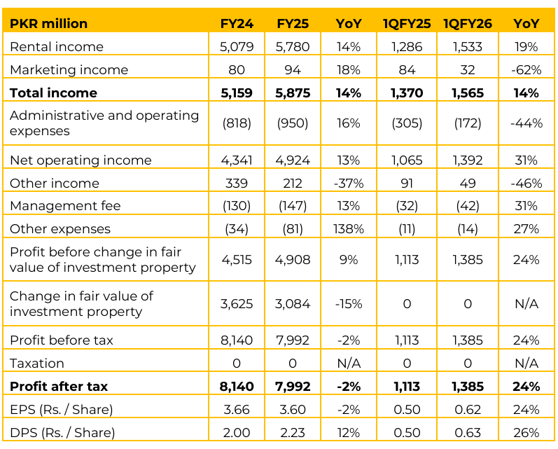 DCR reported earnings per share of PKR 3.60 in FY25 vs loss per share of PKR 3.66 in FY24. In 1QFY26, the EPS remained PKR 0.62 (1QFY25: 0.50). Average Rental Yield for Mall and Harbor Front is around 8%. Average Rent per Square Foot for all is PKR 650, and Harbor Front is around PKR 450.