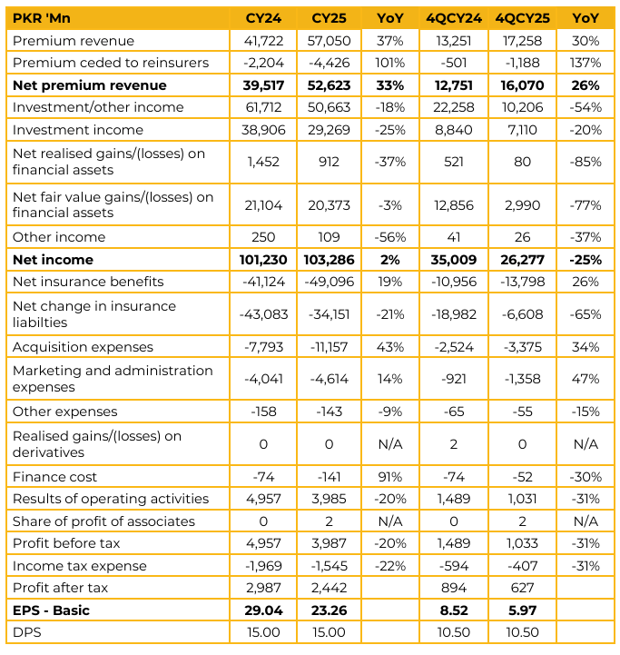 The company recently obtained an SECP license for the VPS, enabling the launch of both individual and corporate VPS products, along with annuity solutions. A key highlight is the revamped individual health plan, “Mukamal Sehat,” launched in Q3 CY25, which has seen a strong market response.
