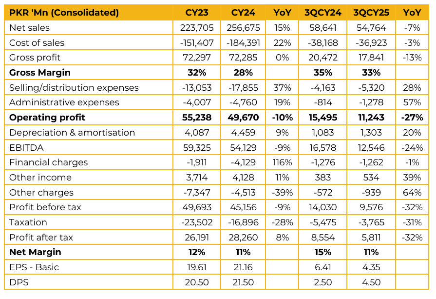 Engro Fertilizers Limited (EFERT) reported consolidated earnings per share of PKR 21.16 for CY24, compared to PKR 19.61 in CY23. Furthermore, in 3QCY25, the company reported earnings per share of PKR 4.35, compared to earnings per share of PKR 6.41 in the same period last year (SPLY).