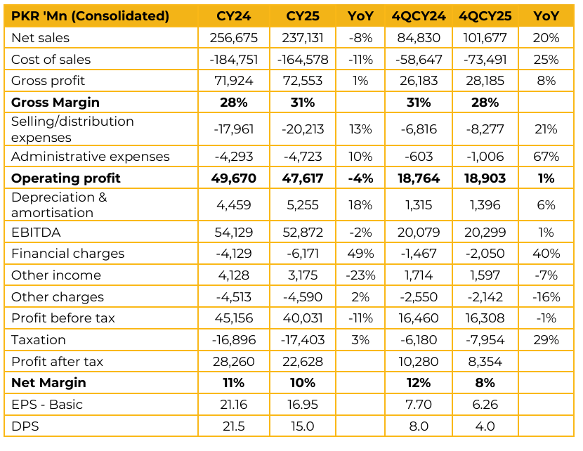 The 20% decline in profit was attributed to three major factors, each impacting earnings by approximately PKR 2bn: Super Tax, higher finance costs due to carrying elevated inventory levels throughout the year, and increased freight charges associated with managing and distributing that inventory.