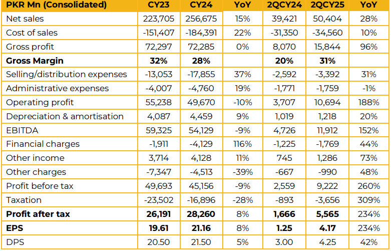 In this fiscal year the company has seen its gross margin improve to 31% in 2QCY25 compared to 20% in SPLY. Net revenue in 2QCY25 was PKR 50.4 Bn, up 28% from PKR 39.4 Bn in 2QCY24. Earnings per share for 2QCY25 clocked in at PKR 4.17, up 234% from PKR 1.25 in 2QCY24. EFERT saw a market share of 34% in 2QCY25 compared to 24% in 1QCY25 in urea sales. Management noted that the urea market remains under stress due to weak farm economics.