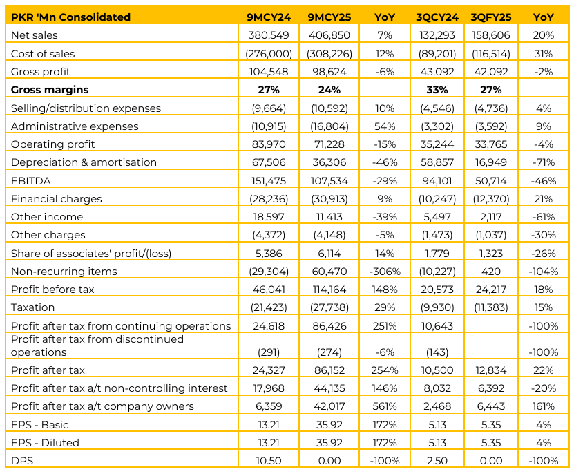 ENGROH has reported consolidated earnings per share of PKR 35.92 in 9MCY25 (9MCY24: PKR 13.21). Furthermore, in 3QCY25 the company reported EPS of PKR 5.35 (3QFY24 EPS: PKR 5.13). The management reiterated three major changes affecting the 2025 financial statements. One being that Engro Holding was formed and Engro Corp was delisted. The number of shares increased significantly from 481 million to 1.2 billion. This change must be noted when calculating Earnings Per Share (EPS) and owner share profit.