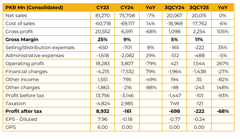 Engro Polymer & Chemicals Limited recorded diluted loss per share of PKR 0.18 in CY24, as compared to earnings per share of PKR 7.96 in CY23. The company recorded net sales of PKR 75.7 Bn, down 7% from PKR 81.3 Bn in CY23. Along with this, it saw its gross margin contract from 25% in CY23 to 9% in CY24. As a result, gross profit reduced 68% from PKR 20.6 Bn in CY23 to PKR 6.6 Bn in CY24. EPCL posted loss after tax of PKR 161 Mn in CY24, compared to profit after tax of PKR 8.9 Bn in CY23. In 3QCY25, the company saw its gross margin improve to 11% compared to 5% in SPLY. This was driven by cost efficiencies and an improvement in core delta.