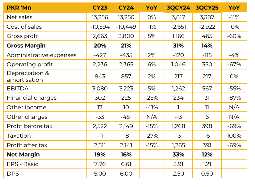 Engro Powergen Qadirpur Limited (EPQL) reported earnings per share of PKR 6.61 for CY24, compared to PKR 7.76 in CY23. Furthermore, in 3QCY25, the company reported earnings per share of PKR 1.21, compared to earnings per share of PKR 3.91 in the same period last year (SPLY).