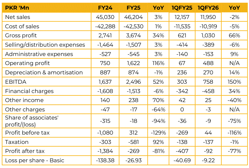 Faisal Spinning Mills Limited (FASM) reported loss per share of PKR 26.93 for FY25, compared to PKR 138.38 in FY24. Furthermore, in 1QFY26, the company reported loss per share of PKR 9.22, compared to loss per share of PKR 40.69 in the same period last year (SPLY).