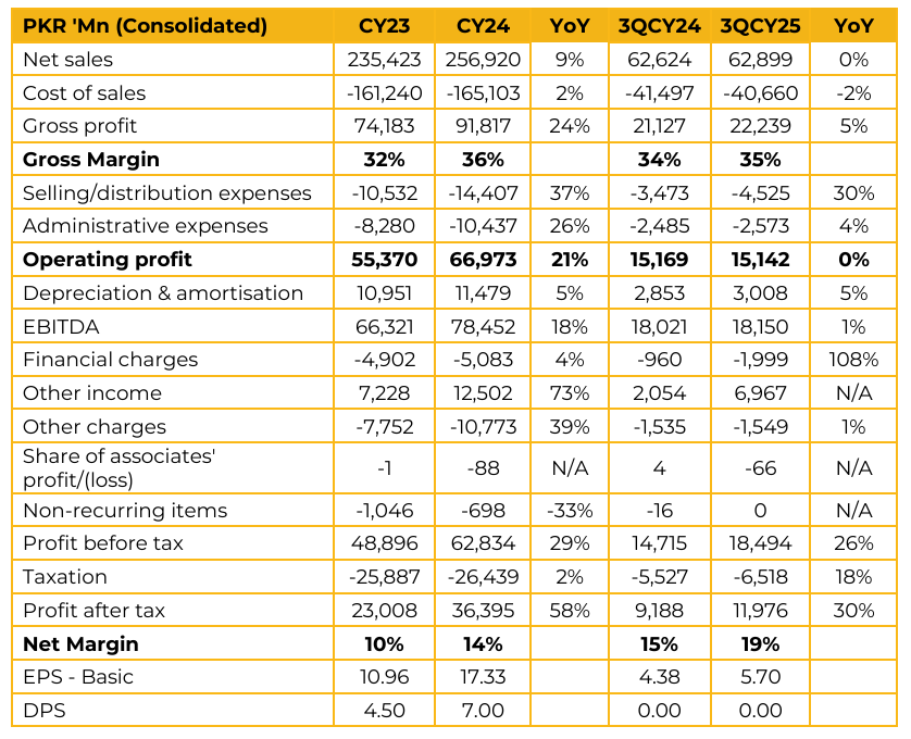 Fatima Fertilizer Company Limited Limited (FATIMA) reported earnings per share of PKR 17.33 for CY24, compared to earnings per share of PKR 10.96 in CY23. Furthermore, in 3QCY25, the company reported earnings per share of PKR 5.70, compared to earnings per share of PKR 4.38 in the same period last year (SPLY). Despite a declining market, Fatima expanded its total market share by 4.4ppt to 30.1%.