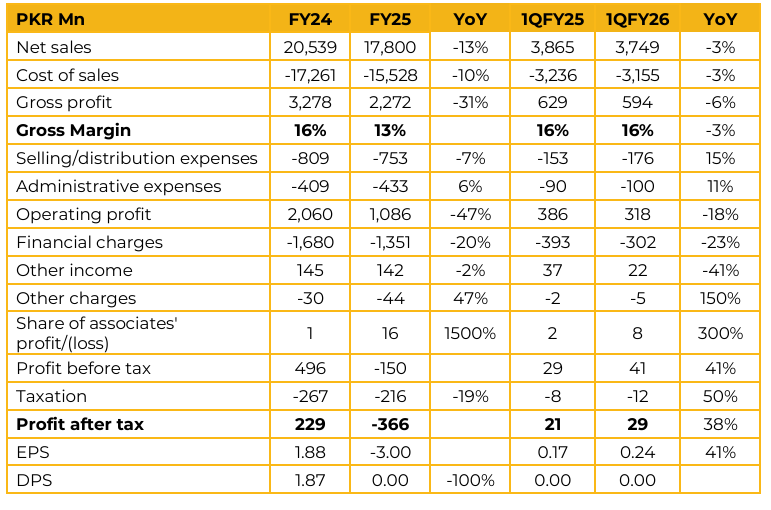 The company recorded net sales of PKR 17.8 Bn, down 13% from PKR 20.5 Bn in FY24. Along with this it saw its gross margin contract from 16% in FY24 to 13% in FY25. As a result, gross profit reduced 31% from PKR 3.3 Bn in FY24 to PKR 2.3 Bn in FY25. GTYR posted loss after tax of PKR 366 Mn in FY25, compared to profit after tax of PKR 229 Mn in FY24.