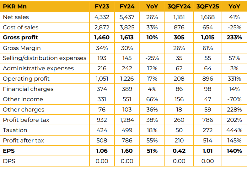 The company reported earnings per share of PKR 1.01 in 3QFY25, up 140% compared to 3QFY24. This was also a growth of 23% when compared to PKR 0.82 in 2QFY25. The management apprised that its 275 TPD plant located in Hattar Special Economic Zone was commissioned in April 2025. It expects this to significantly contribute to the profitability of the company due to its efficiency and lower fuel costs along with the 10 year income tax holiday this plant has received. Additionally, the management is looking into adding solar at all of its sites in order to control its energy costs.