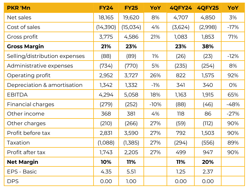 Gharibwal Cement Limited (GWLC) reported earnings per share of PKR 5.51 for FY25 (FY24: 4.35). Furthermore, in 4QFY25, the company reported earnings per share of PKR 2.37 (4QFY24: 1.25). Dispatches for FY25 totaled 1.2 million tons. The average retention price during FY25 was stated as being around PKR 16,000 per ton. The current retention price (as of October 2025) is approximately PKR 15,000 per ton.