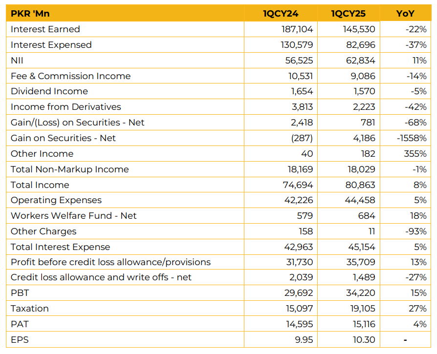 In 1QCY25, HBL reported an unconsolidated profit of PKR 15.12 billion (EPS: PKR 10.30), reflecting a 4% YoY increase compared to PKR 14.59 billion (EPS: PKR 9.95) in the same period last year. Total income increased by 8% YoY to PKR 80.86 billion, supported by strong growth in both net interest income (NII) and non-markup income.