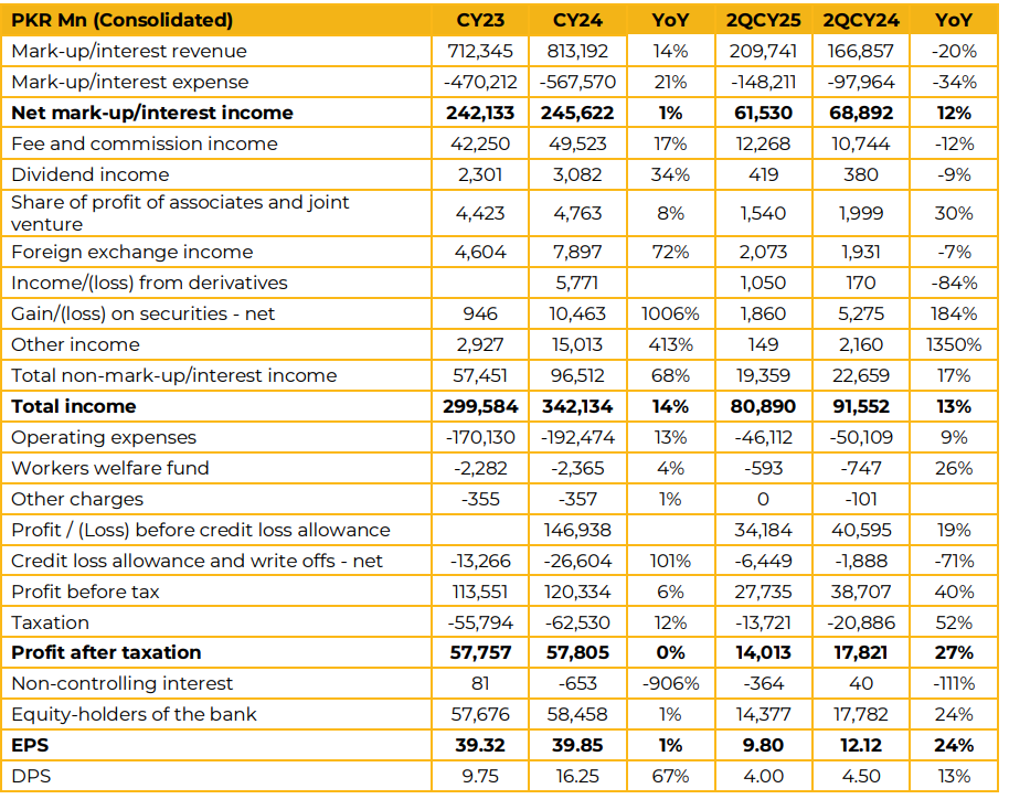 Habib Bank Limited reported consolidated earnings per share of PKR 12.12 in 2QCY25, up 24% from PKR 9.80 in 2QCY24. This translates into profit after tax of PKR 17.8 Bn compared to PKR 14.4 Bn in SPLY. The bank declared a dividend of PKR 4.5 per share in 2QCY25, up 13% from PKR 4.0 in 2QCY24. Total revenue in 2QCY25 reached PKR 91.6 Bn against PKR 80.9 Bn in 2QCY24, an increase of 13%.