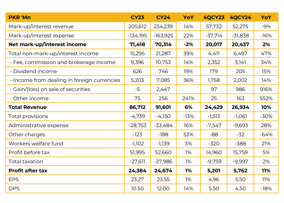 Habib Metropolitan Bank Limited reported unconsolidated earnings per share of PKR 23.55 in CY24 against earnings per share of PKR 23.27 in CY23, an increase of 1%. This translates into profit after tax of PKR 24.7 Bn in CY24 compared to PKR 24.4 Bn in CY23. The bank declared a dividend of PKR 12 per share in CY24 compared to PKR 10.5 in CY23. It is pertinent to note here that the bank now distributes dividend on a quarterly basis.