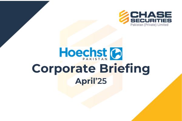 Disclaimer: This report has been prepared by Chase Securities Pakistan (Private) Limited and is provided for information purposes only. Under no circumstances, this is to be used or considered as an offer to sell or solicitation or any offer to buy. While reasonable care has been taken to ensure that the information contained in this report is not untrue or misleading at the time of its publication, Chase Securities makes no representation as to its accuracy or completeness and it should not be relied upon as such. From time to time, Chase Securities and/or any of its officers or directors may, as permitted by applicable laws, have a position, or otherwise be interested in any transaction, in any securities directly or indirectly subject of this report Chase Securities as a firm may have business relationships, including investment banking relationships with the companies referred to in this report This report is provided only for the information of professional advisers who are expected to make their own investment decisions without undue reliance on this report and Chase Securities accepts no responsibility whatsoever for any direct or indirect consequential loss arising from any use of this report or its contents At the same time, it should be noted that investments in capital markets are also subject to market risks This report may not be reproduced, distributed or published by any recipient for any purpose.