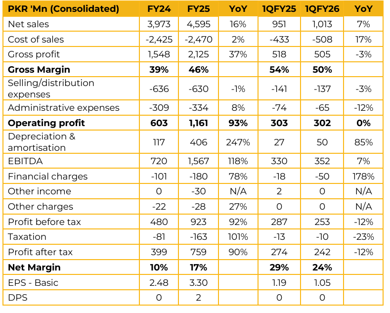Image Pakistan Limited (IMAGE) reported consolidated earnings per share of PKR 3.30 for FY25, compared to PKR 2.48 in FY24. Furthermore, in 1QFY26, the company reported earnings per share of PKR 1.05, compared to earnings per share of PKR 1.19 in the same period last year (SPLY).