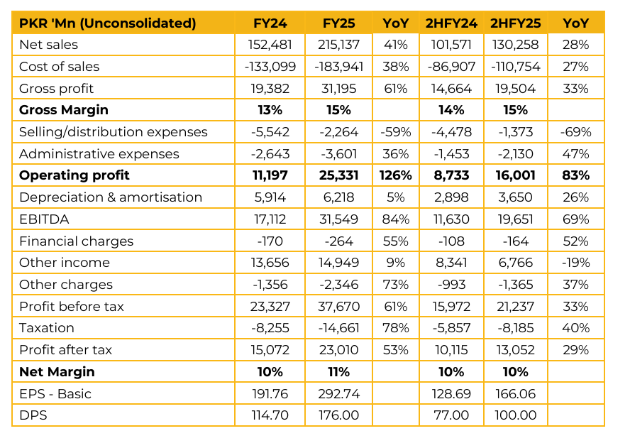 Indus Motor Company Limited (INDU) reported earnings per share of PKR 292.74 for FY25, compared to PKR 191.76 in FY24. Furthermore, in 2HFY25, the company reported earnings per share of PKR 166.06, compared to PKR 128.69 in the same period last year (SPLY).