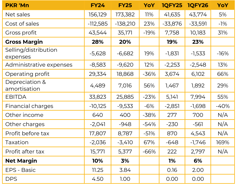 Interloop Limited (ILP) reported earnings per share of PKR 3.84 for FY25, compared to PKR 11.25 in FY24. Furthermore, in 1QFY26, the company reported earnings per share of PKR 2.00, compared to earnings per share of PKR 0.16 in the same period last year (SPLY).
