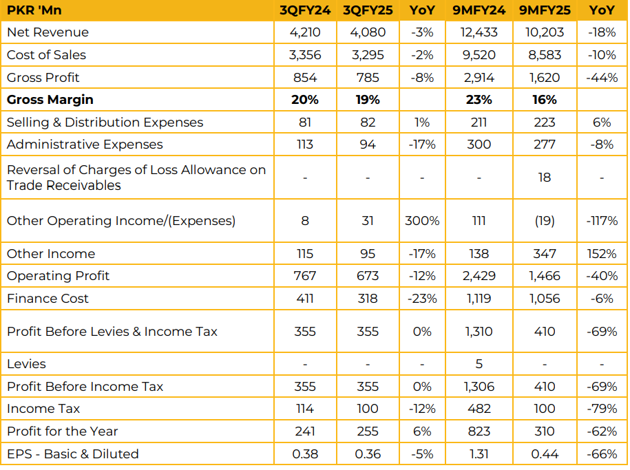 IPAK reported a net profit of PKR 309.89 million (EPS: PKR 0.44) in 9MFY25, down 62% YoY from PKR 823.38 million (EPS: PKR 1.31) in 9MFY24. The decline in profitability was despite strong topline growth, primarily due to elevated costs and a shift in product mix.