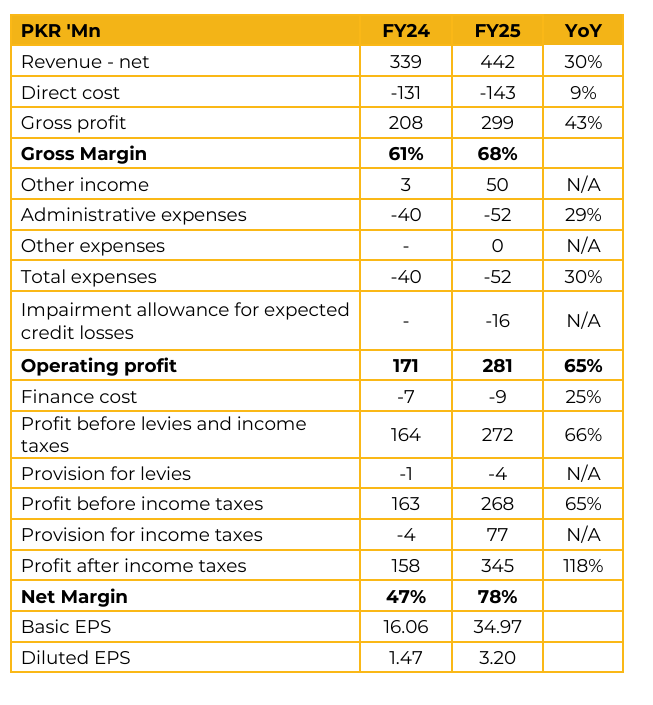 Itanz Technologies Limited (ITANZ) reported earnings per share of PKR 3.20 for FY25, compared to earnings per share of PKR 1.47 in FY24. The Company reported net revenue of PKR 242 million and a net profit of PKR 161 million during H1 FY26. Approximately 90% of earnings are derived from international markets, comprising SaaS product revenue and consulting income. The Company’s core verticals include the public sector (Australia), healthcare (UK), and the financial sector (Pakistan and regional markets). Management is gradually shifting the revenue base away from pure consulting toward Annual Recurring Revenue ARR and SaaS models to enhance bottom line profitability.