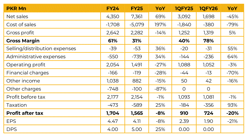The company recorded net sales of PKR 7.4 Bn, up 69% from PKR 4.4 Bn in FY24. Along with this, it saw its gross margin contract from 61% in FY24 to 31% in FY25. As a result, gross profit fell 14% from PKR 2.6 Bn in FY24 to PKR 2.3 Bn in FY25. JVDC posted profit after tax of PKR 1.6 Bn in FY25, compared to PKR 1.7 Bn in FY24. In 1QFY26, the company saw its gross margin expand to 78% from 40% in SPLY. Profit after tax fell 20% to PKR 724 Mn during the period compared to PKR 910 Mn in 1QFY25 due to lower revenue.