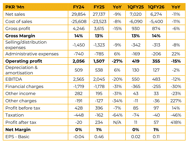 Kohinoor Mills Limited (KML) reported earnings per share of PKR 0.46 for FY25, compared to loss per share of PKR 0.04 in FY24. Furthermore, in 1QFY26, the company reported earnings per share of PKR 0.11, compared to earnings per share of PKR 0.02 in the same period last year (SPLY). The Weaving Division has an annual capacity of 55 million meters. Production volumes have increased significantly following recent BMR initiatives, rising from 39 million meters in 2019 to approximately 53 million meters per annum.