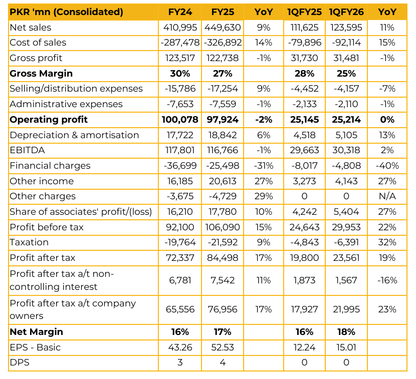 Lucky Cement Limited (LUCK) reported consolidated earnings per share of PKR 52.53 for FY25, compared to earnings per share of PKR 43.26 in FY24.
