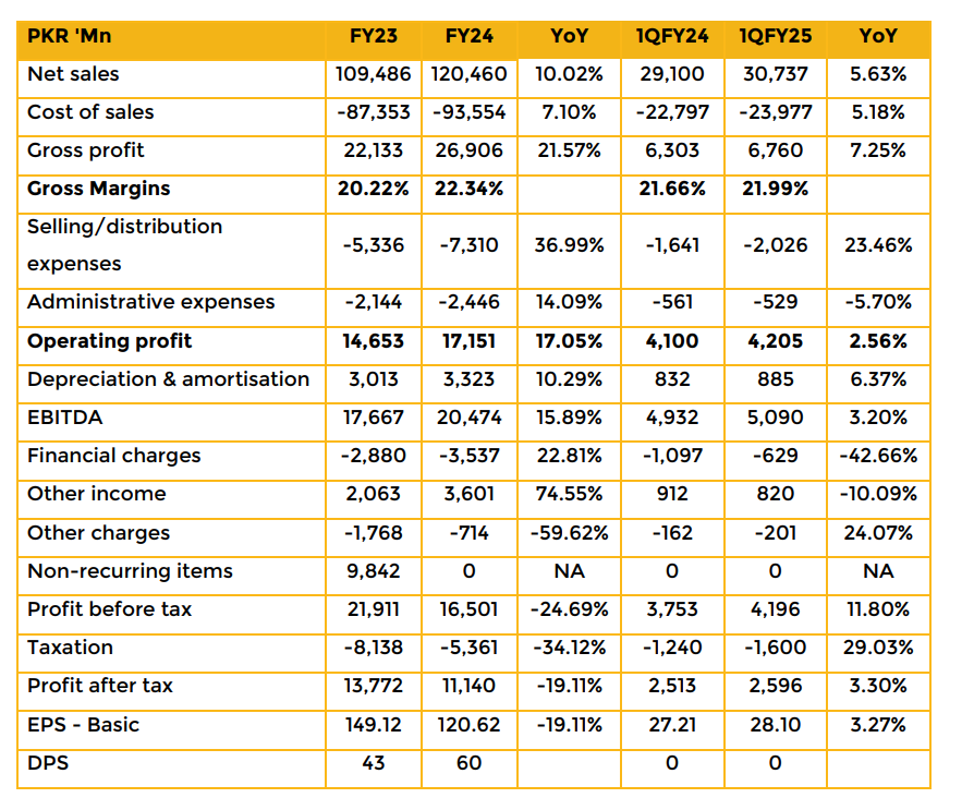 Lucky Core Industries Limited reported earnings per share (EPS) of PKR 120.62 in FY24, compared to PKR 149.12 in FY23. In 1QFY25, the company posted an EPS of PKR 28.10, slightly higher than PKR 27.21 in the same period last year. The polyester and pharmaceutical segments performed well during the year, driving improved operating performance. In the soda ash segment, both local and export volumes remained subdued.