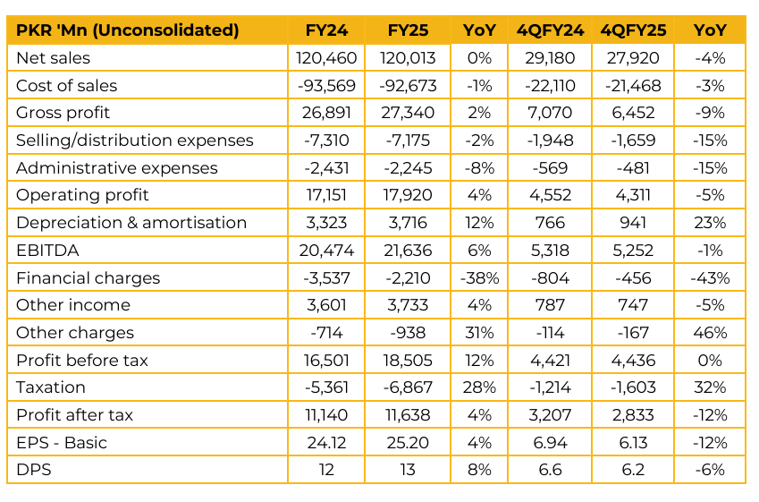 Lucky Core Industries Limited recorded earnings per share of PKR 25.20 in FY25, as compared to earning per share of PKR 24.12 in FY24. In 4QFY25, the company reported an earnings per share of PKR 6.13, as compared to earnings per share of PKR 6.94 in 4QFY24.