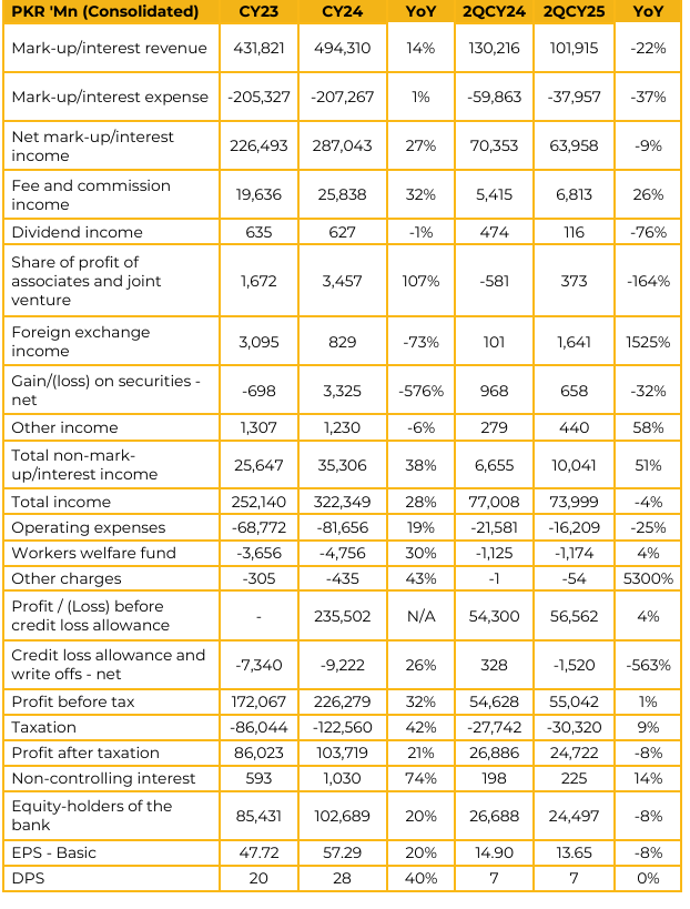 Meezan Bank Limited reported a consolidated profit after tax of PKR 103.7bn in CY24, an increase from the PKR 86bn reported in CY23. However, the company’s profit after tax in 2QCY25 was PKR 24.7bn, a decrease from PKR 26.9bn in 2QCY24. The bank’s total deposits are PKR 3.04 trillion, comprising 51% in current accounts and 43% in savings accounts. Current account deposits have risen by 36% YoY.