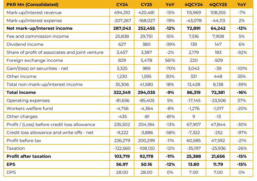 Meezan Bank Limited reported consolidated earnings per share of PKR 50.16 in CY25, down 12% from PKR 56.97 in CY24. This translates into profit after tax of PKR 92.2 Bn compared to PKR 103.7 Bn in SPLY. The bank declared a dividend of PKR 28 per share in CY25, in line with PKR 28 in CY24.