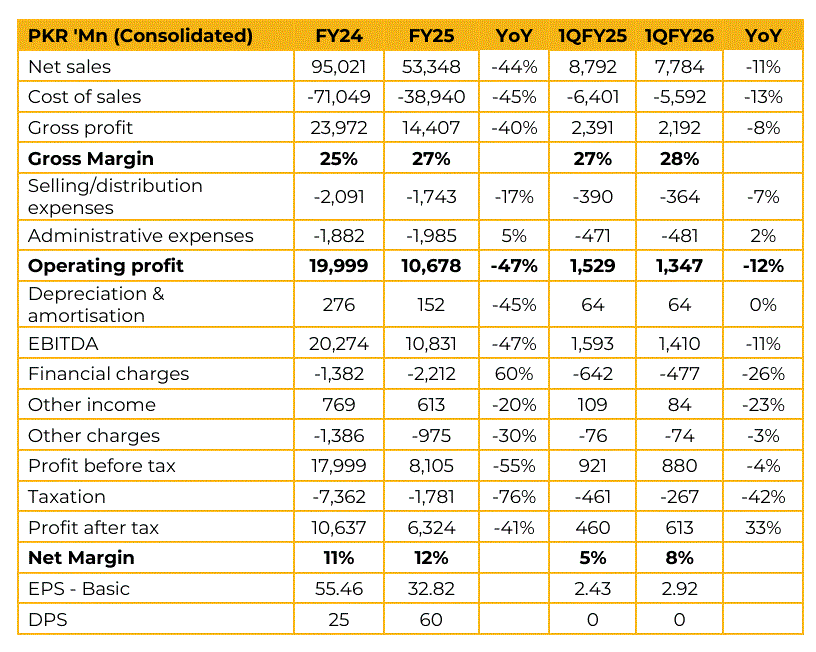 Millat Tractors Limited (MTL) reported consolidated earnings per share of PKR 32.82 for FY25, compared to PKR 55.46 in FY24. Furthermore, in 1QFY26, the company reported earnings per share of PKR 2.92, compared to earnings per share of PKR 2.43 in the same period last year (SPLY). MTL primarily manufactures Massey Ferguson–branded farm tractors ranging from 50 to 85 Horse Power (HP), including both two wheel and four wheel drive models.