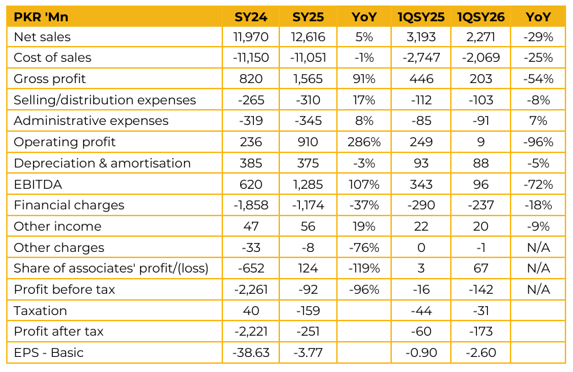 Mirpurkhas Sugar Mills Limited (MIRKS) reported loss per share of PKR 3.77 for SY25, compared to loss per share of PKR 38.63 in SY24. Furthermore, in 1QSY26, the company reported loss per share of PKR 2.60, compared to loss per share of PKR 0.90 in the same period last year (SPLY). National sugar production is projected at 6.8–7.0 million tons against estimated consumption of 6.3–6.4 million tons, resulting in a surplus of 0.5–0.7 million tons.