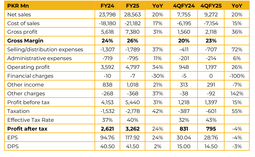 As a result, gross profit increased 31% from PKR 5.6 Bn in FY24 to PKR 7.4 Bn in FY25. MUREB posted profit after tax of PKR 3.3 Bn in FY25, up 24% from PKR 2.6 Bn in FY24. The company is currently investing in new machinery including a PentAir carbo controller, a PET CSD filling line, two new sticker labelling machines, a new maturation cellar, a new ammonia compressor, ring pull capping machine, shrink wrap machine and the setting up of a 130 TPD glass furnace.