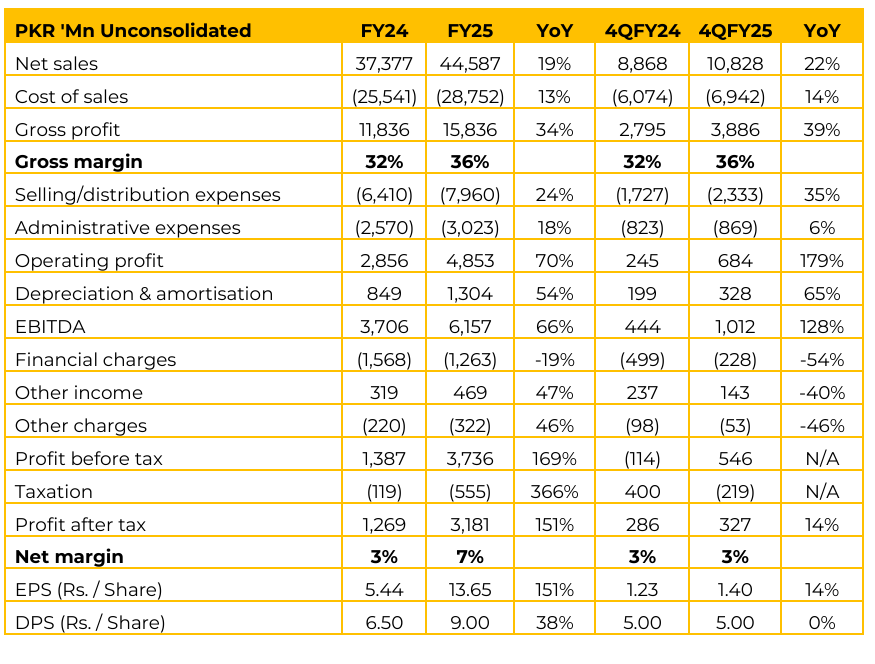 National Foods Limited (NATF) reported earnings per share of PKR 13.65 for FY25 (FY24: 5.44). Furthermore, in 4QFY25, the company reported earnings per share of PKR 1.40 (4QFY24: 1.23). Gross margins improved in 1QFY26 to 38% from average of 36% in FY25 primarily due to pricing factor and cost efficiencies associated with the Faisalabad plant.