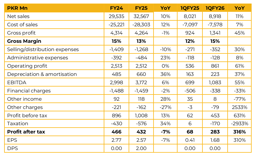 Panther Tyres Limited recorded earnings per share of PKR 2.57 in FY25, as compared to PKR 2.77 in FY24. The company recorded net sales of PKR 32.6 Bn, in line with PKR 29.5 Bn in FY24. During FY25, the company’s gross margin contracted to 13%, compared to 15% in FY24. Along with this, it saw its gross profit decrease 1% from PKR 4.31 Bn in FY24 to PKR 4.26 Bn in FY25. PTL posted profit after tax of PKR 432 Mn in FY25, compared to PKR 466 Mn in FY24.