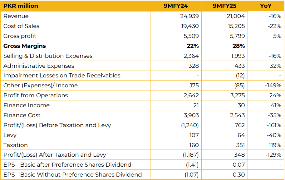 Power Cement Limited reported a net profit of PKR 347.93 million (EPS: PKR 0.07) in 9MFY24, compared to a net loss of PKR 1.19 billion (LPS: PKR 1.41) in SPLY, primarily due to lower finance costs and operational efficiencies. The company recorded its first positive profit before tax in six years.